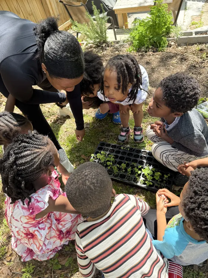 ID: A Black educator, Jameela Calloway guides several young Black children in watering soil outdoors as part of Ancestors' Seeds, a Montessori program.